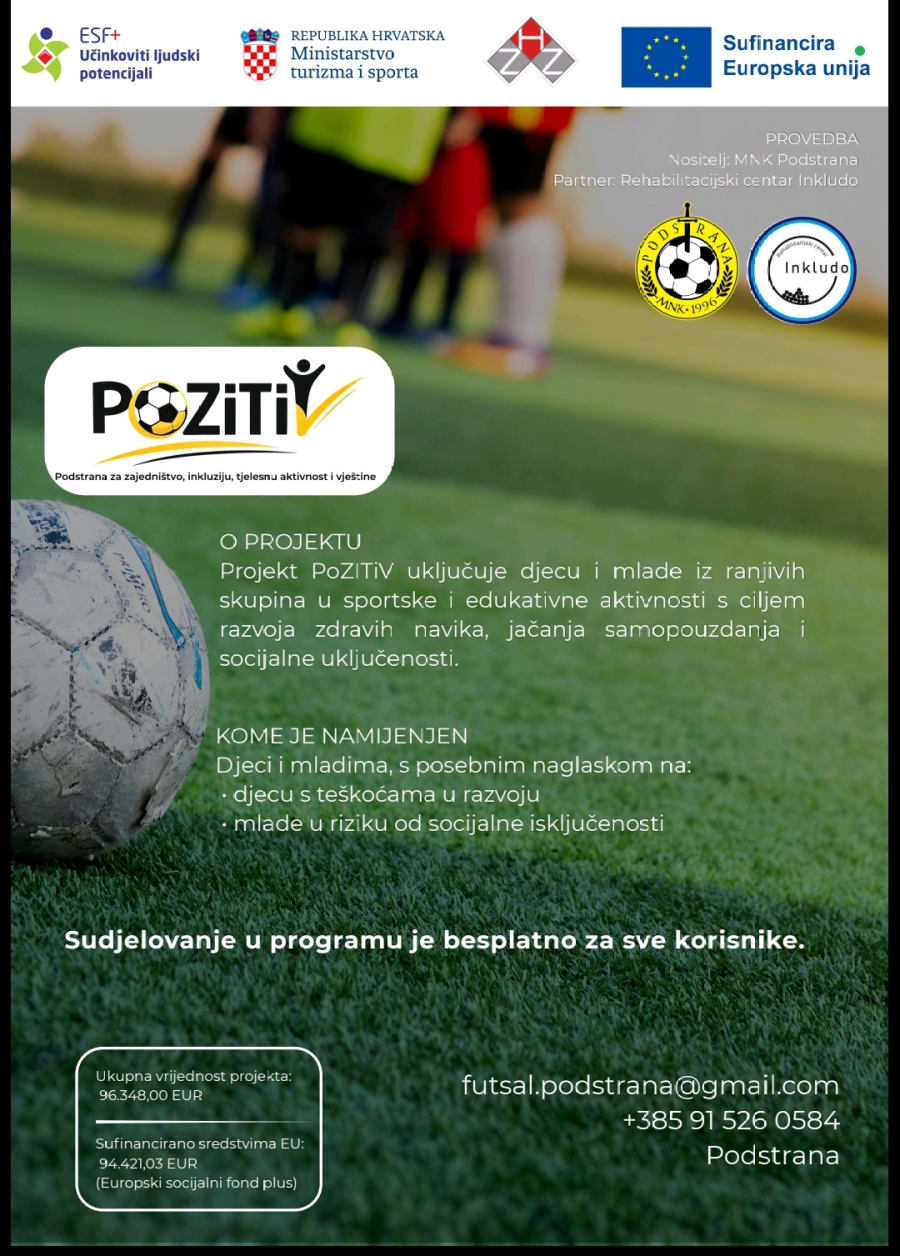 Malonogometni klub Podstrana, kao nositelj projekta, u partnerstvu s Rehabilitacijskim centrom Inkludo, započeo je s provedbom projekta PoZITiV – Podstrana za zajedništvo, inkluziju, tjelesnu aktivnost i vještine.