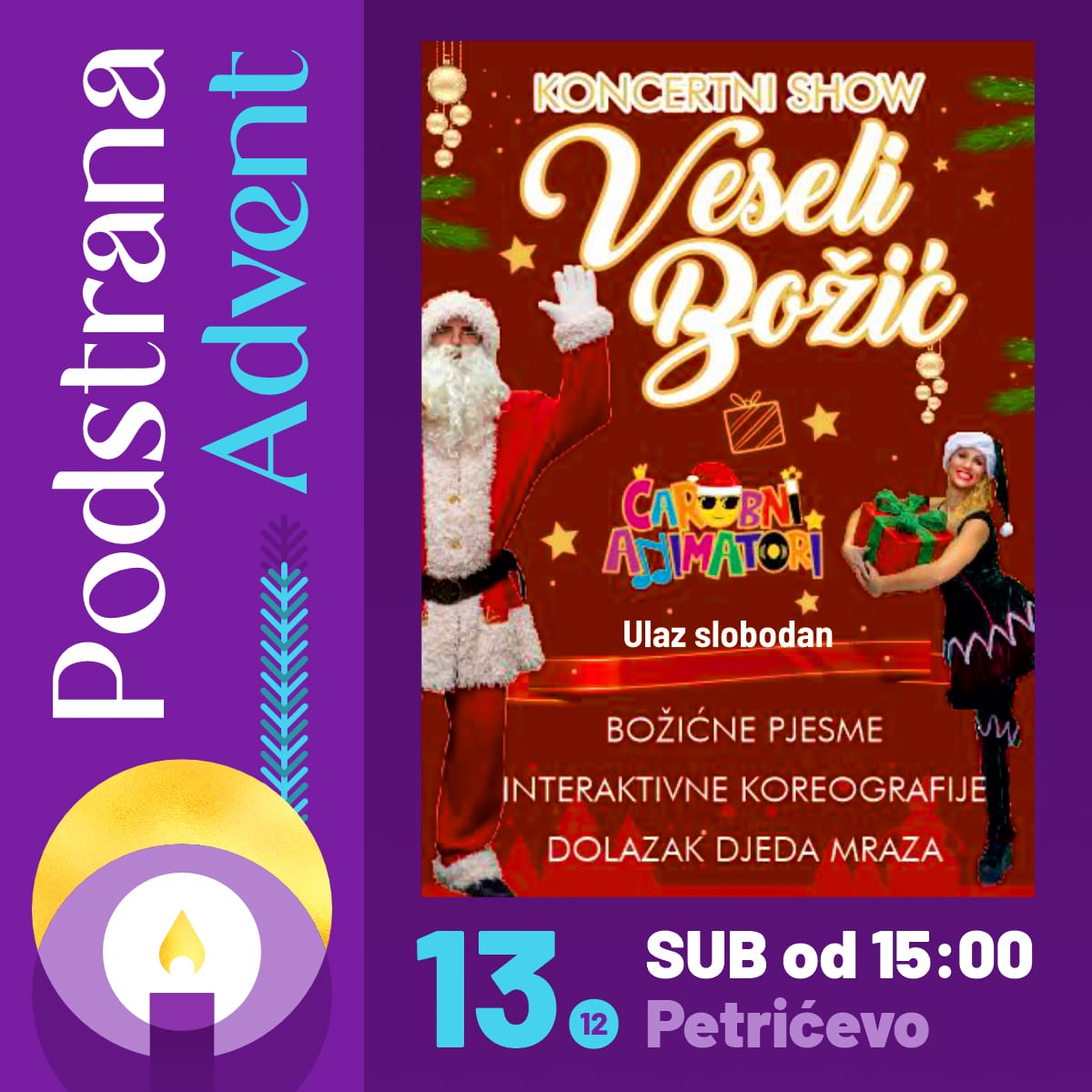 Već od 15 sati čeka te razigrani dječji program u susret Božiću uz čarobne animatore, a u 16 sati otvara se kreativna radionica za najmlađe…